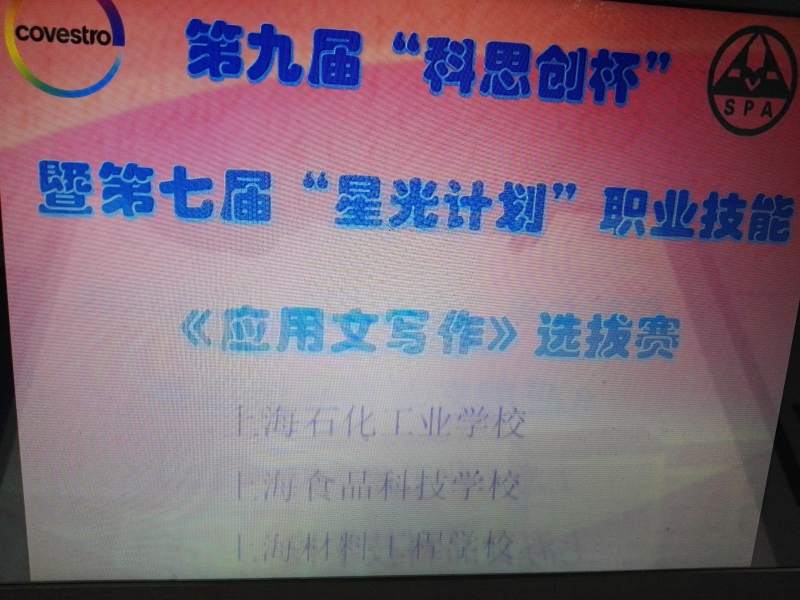 上海市“星光计划”是中职院校技能比武的平台。为了迎接即将到来的大赛,2016年12月14日下午2:15,在我校A区208教室隆重举行了第九届“科思创杯”暨第七届“星光计划”职业技能竞赛应用文写作大赛。上海食品科技学校、上海工程技术管理学校、上海材料工程学校等四个兄弟学校也积极参与了我校组织的活动。