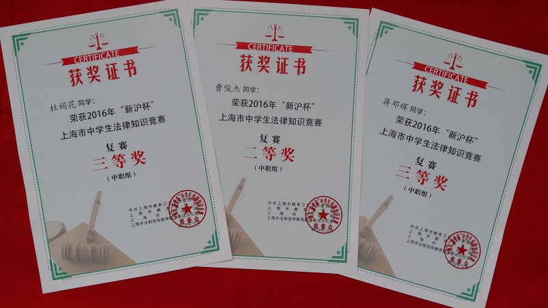 近日,由上海市教卫党委、市教委、市司法局、市法宣办举办的2016年上海市“新沪杯”中学生法律知识竞赛活动圆满落幕,下发各类奖项。2016年12月8日在上海市行政管理学校举行的中职组团体总决赛中,由曹俊杰、蒋邓辉、杜娟花、张怡等四位同学组队荣获中职组团体二等奖。在个人复赛中,曹俊杰荣获二等奖、蒋邓辉、杜娟花荣获三等奖。