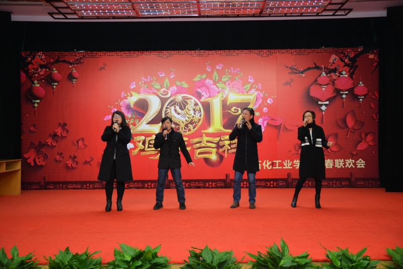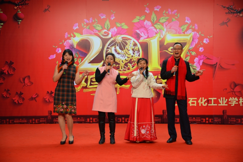 1月13日下午我校报告厅里张灯结彩,花团锦簇,全体教职工欢聚一堂共庆2017年新春。