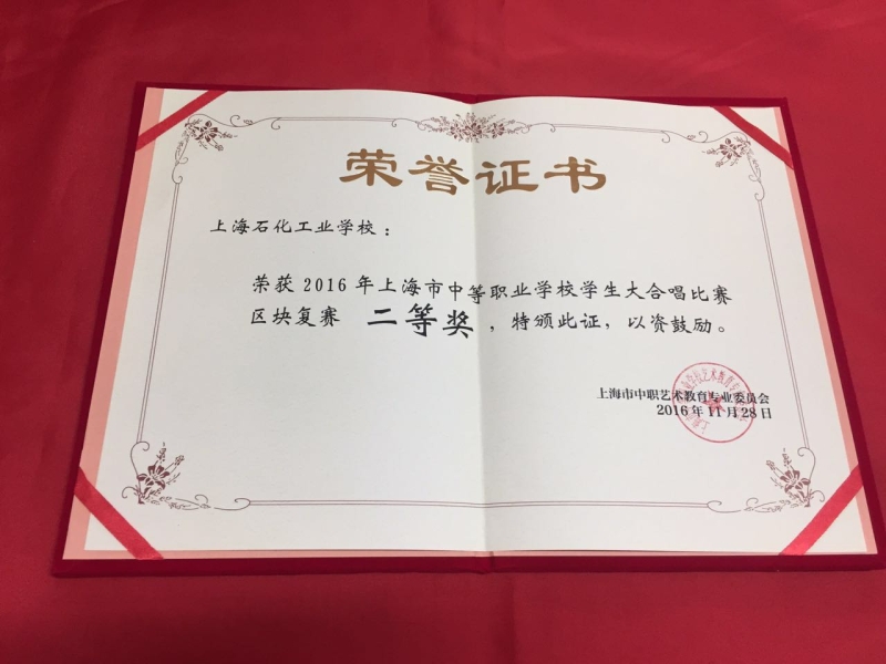 2016年10月28日,我校合唱队同学们期待已久的合唱比赛在上海市舞蹈学校正式拉开帷幕。由我校合唱队表演的合唱作品《璀璨星光—中职生之歌》、《啊,朋友再见》荣获上海市中职学生大合唱比赛二等奖。