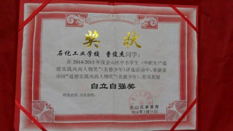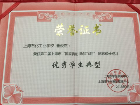 学校推荐他参加上海市第22届“温馨冬至夜”活动,成为金山区唯一获得上海慈善基金会最高资助的学生,这些来社会和学校的帮助无时无刻不在感动着他,他用实际行动努力回馈社会和学校。2016年曹俊杰荣获了金山区“道德实践风尚人物”奖,入选第二届上海市“国家资助 助我飞翔”励志成长成才优秀学生典型。