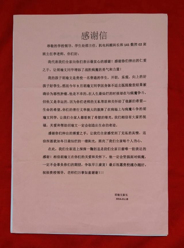 这笔善款带着广大师生的祝愿,化成汩汩甘泉、缕缕阳光,温暖着胡瑜文和其家人的心。为此家长给学校送来了感谢信,感谢学校用真情谱写出和谐校园爱的乐章。