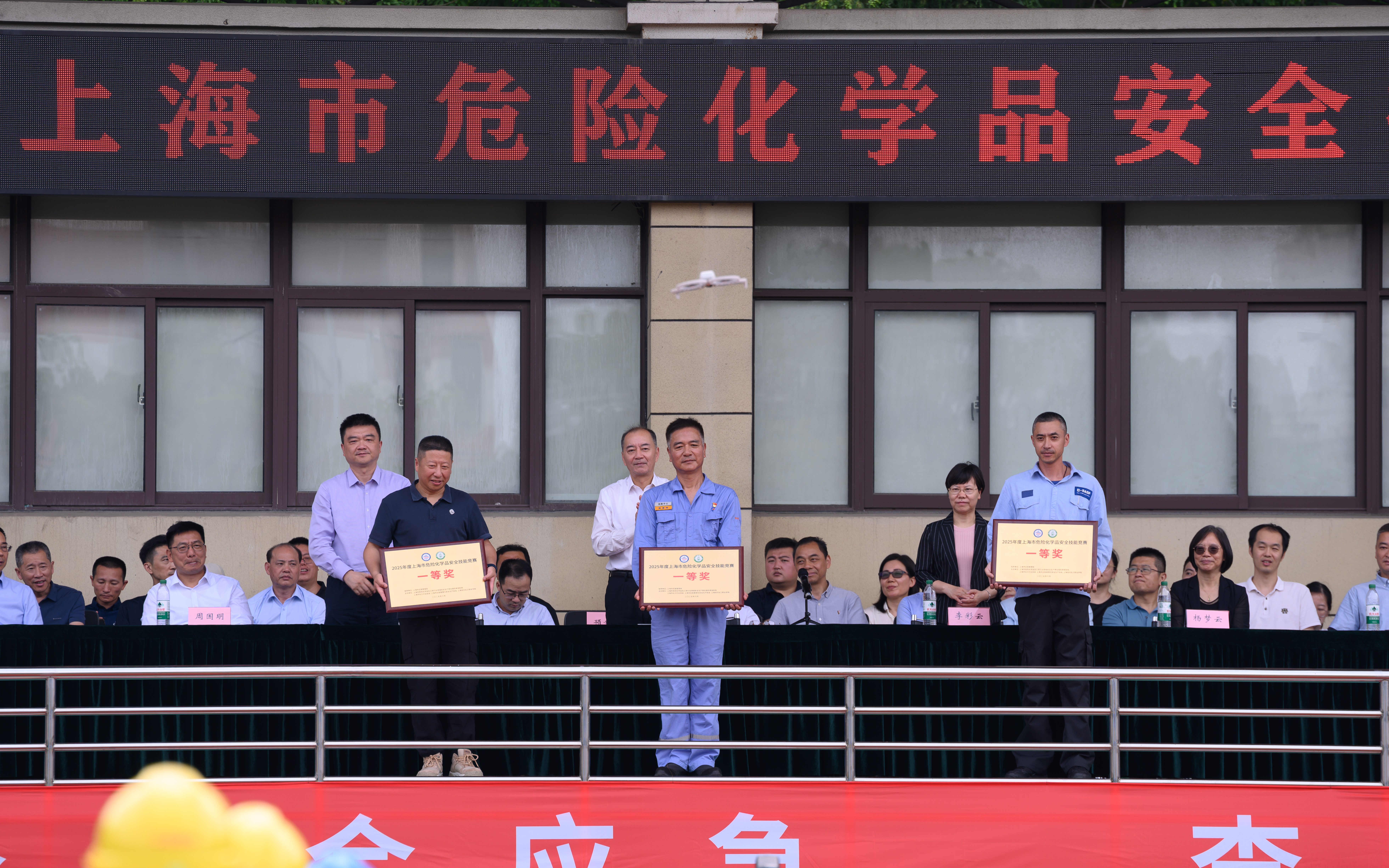 颁奖环节将现场气氛推向高潮。与会领导依次为获奖队伍颁发奖杯,上海赛科石油化工有限责任公司参赛队在“三人三盘水带连接操”项目中荣获一等奖,上海氯碱化工股份有限公司参赛队在“推车式干粉灭火器灭油槽火”项目中荣获一等奖,巴斯夫化工有限公司参赛队则在“有毒空间人员救援”项目中荣获一等奖,多个团队分获二、三等奖及优胜奖。获奖队员手捧奖杯表示,竞赛不仅是技能展示的平台,更是对日常安全培训成果的检验,未来将把赛场经验转化为岗位实践,为城市安全贡献力量。