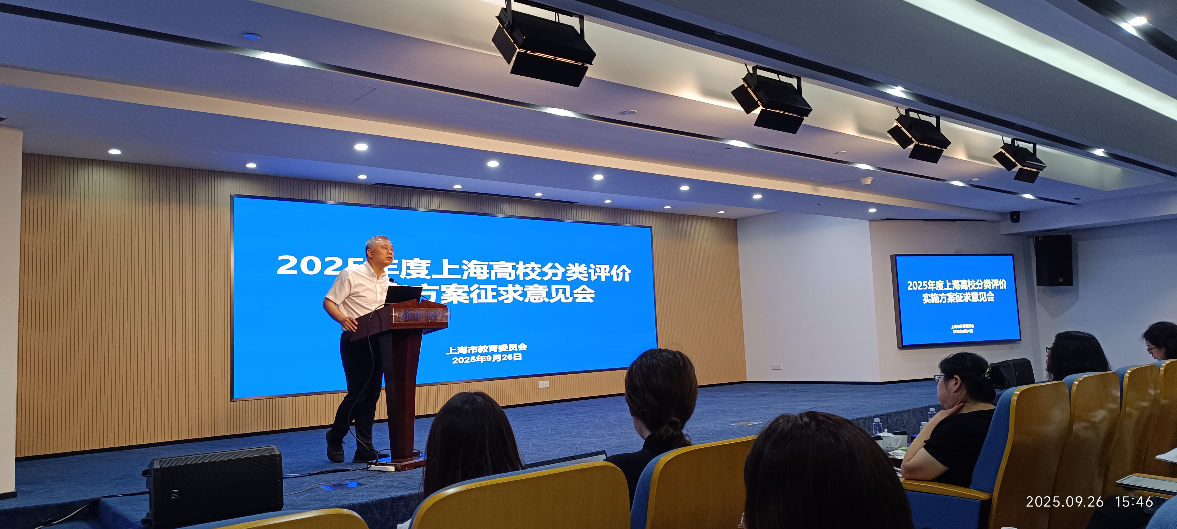 9月26日,2025年度上海高校分类评价征求意见会在上海对外经贸大学召开。上海市教委副主任刘玉祥发表讲话,市教育评估院及市教委各处室相关负责人到会解读评价指标体系,会议由上海市教委督导室主任焦小峰主持。我校质管办主任俞婕与叶国青老师参加会议。