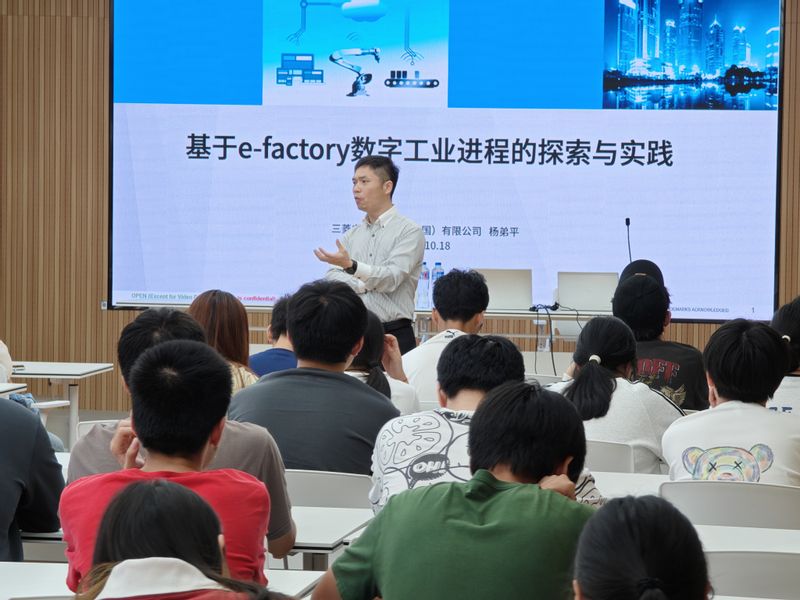 杨经理首先向同学们介绍了三菱集团的历史发展和其业务范畴,其次,聚焦工业自动化,带领学生深入了解中国工业发展历程,并剖析智能制造技术行业现状及痛点。最后,杨经理通过一个个真实案例说明了在智能制造技术日益成为全球工业发展核心的今天,e-factory作为数字工业化的重要实践,正引领着制造业向更高效、更节能、更可持续的方向发展。